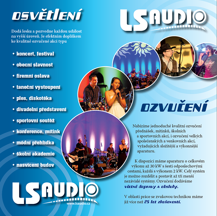 Leszek Sajdok - LS Audio, Bystřice nad Olší Nabízíme Vám komplexní služby v oblasti ozvučení, osvětlení a technické podpory kulturních, sportovních a společenských akcí, školení, výstav, a dalších. Využijte našich dlouholetých zkušeností při poskytování těchto služeb. Ceny jsou sestavovány individuálně podle náročnosti objednaných služeb. Snažíme se však udržet nízkou cenovou hladinu s ohledem na to, aby si nás mohl dovolit najmout skutečně každý. Při pravidelné spolupráci poskytujeme množstevní slevy.